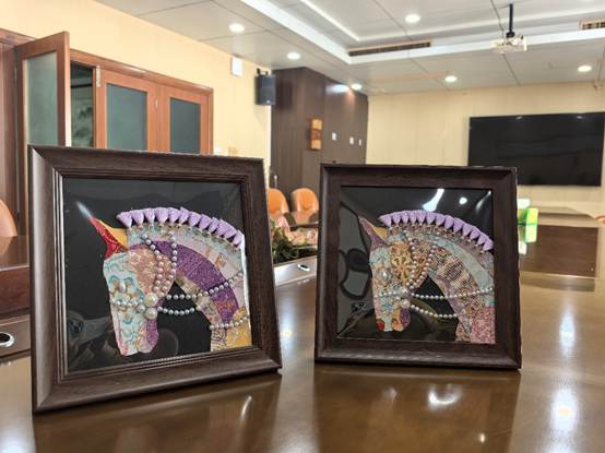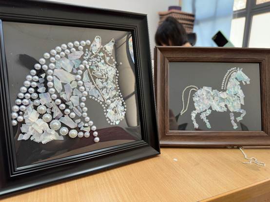 本次活动现场由图书馆部门工会文娱委员丁沫老师担任艺术指导,她现场演示了如何将色彩斑斓的贝壳薄片或青花瓷片镶嵌成精美的图案。随后,女教职工们纷纷化身“匠人”,亲手体验这项千年技艺的独特魅力。她们手执镊子,小心翼翼地将螺钿、珍珠或青花瓷、干花叶按照底稿轮廓粘牢。大家相互交流心得,互相帮助调整细节,现场气氛专注而热烈。原本普通的材料,在一双双巧手的精心制作下,逐渐变成了一幅幅构图巧妙、色彩斑斓、独具匠心的作品。看着自己亲手完成的艺术品,每个人的脸上都绽放出笑靥,充满了成就感与喜悦。